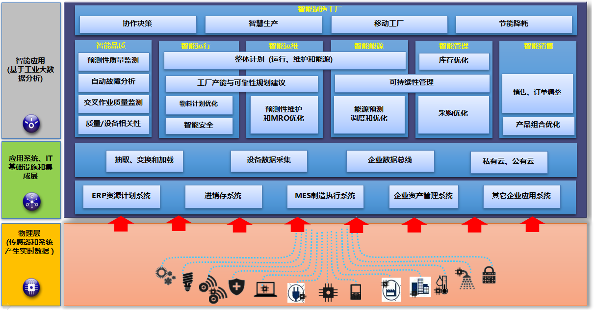 接點(diǎn)智能工廠整體解決方案包括三個(gè)主要層級(jí)功能:實(shí)時(shí)監(jiān)控層、應(yīng)用分析層與云服務(wù)層,三層的主要功能架構(gòu)及技術(shù)產(chǎn)品如下圖: